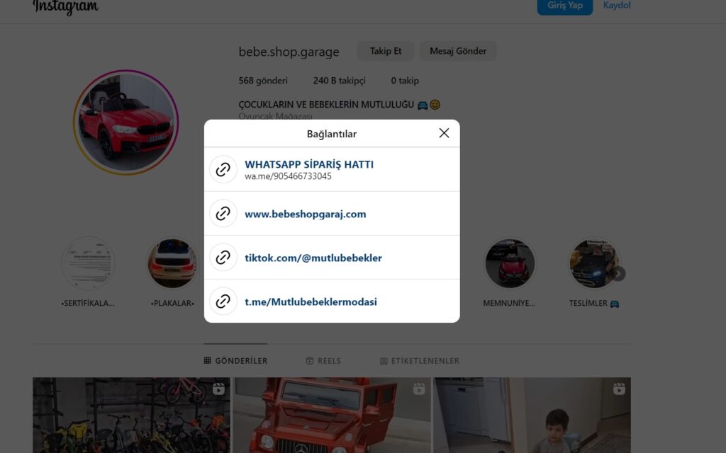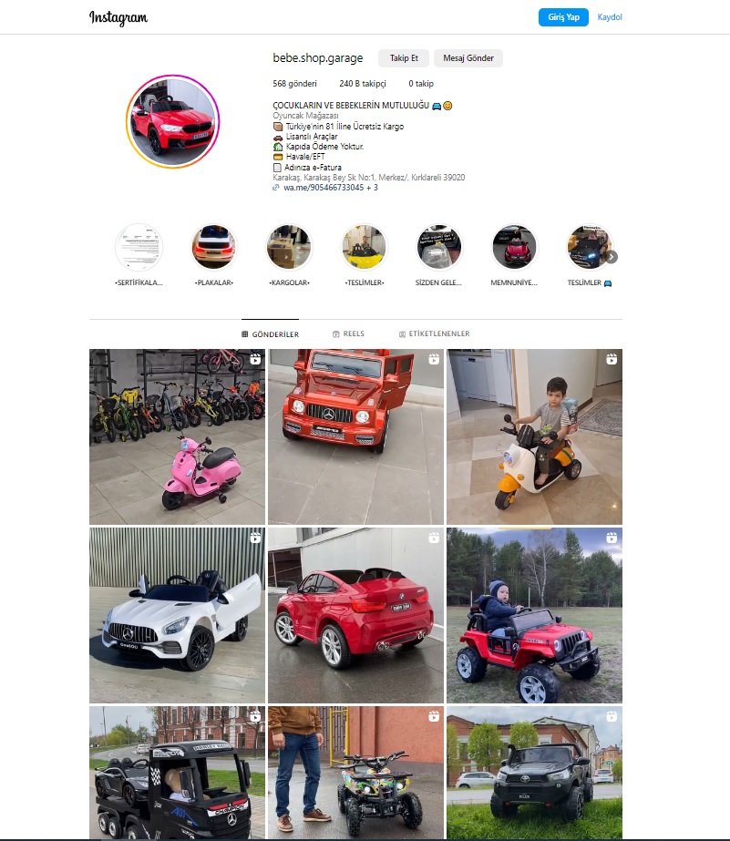 Dolandırıcıların Instagram’dan hesap açarak tuzağına düşündüğü kişi sayısı günden güne artıyor. Son olarak, Instagram’da bebe.shop.garage veya bir kaç ay önce yaptığı dolandırcılık ismi Bebe.car.shop kullanıcı adıyla hesap açan kişiler, sözde oyuncak mağazası adı altında akülü araç videoları paylaşarak milleti dolandırıyorlar.