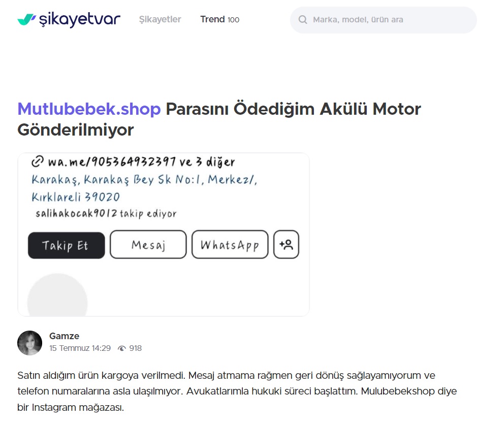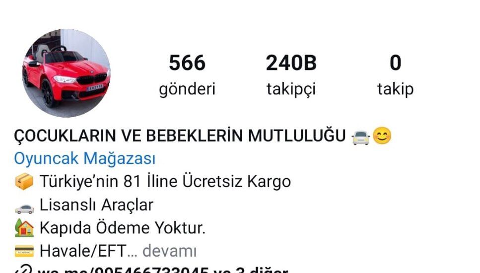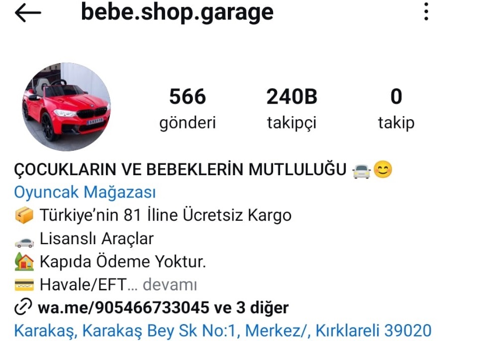 Akülü oyuncak araba ve motor satışı yaptığını iddia eden bebeshopgaraj.com internet sitesi kuran, 0546 673 30 45 whatsApp numarasından görüşme sağlayan, bebe.shop.garage 240 bin takipçili İnstagram hesabından DM yani direkt mesaj ile iletişim kurarak İBANA para isteyen kişiler dolandırıcıdır. Ancak bu whatsApp’ta kullanılan telefon numaraları sürekli değişiyor. Örneğin 0536 493 23 97 numaralı cep telefonun dan whatspApp üzerinden de Mutlu Bebeklerin Modası Bebe.Shop.Car adıyla dolandırıcılık yapıyor. Ancak araştırmalarımda 0536 493 23 97 dolandırıcılık yaptıktan sonra kapatıldığı bilgisine ulaştım. Aynı whatsapp numarasından bebeklerin ve çocukların hayali sloganıyla mutlubebek.shop kullanıcı adıyla da geçmiş ay ve yıllarda dolandırma yapmışlar. Kısacası 200 bin küsurlük instagram hesabının kullanıcı adını sürekli değiştirmek suretiyle dolandırıcılığa devam ediyorlar. Yani uçsuz bucaksız bir mesele…