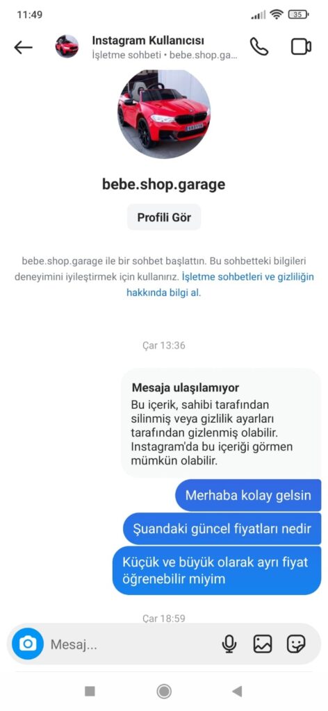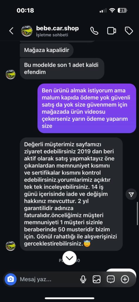 Dolandırıcıların Instagram’daki hesabı https://www.instagram.com/bebe.shop.garage?igsh=YnVtMG9nazJxbWpp , bebe.car.shop Linkteki hesaba ulaşabilirsiniz ancak hesap adını sürekli değiştiriyorlar.